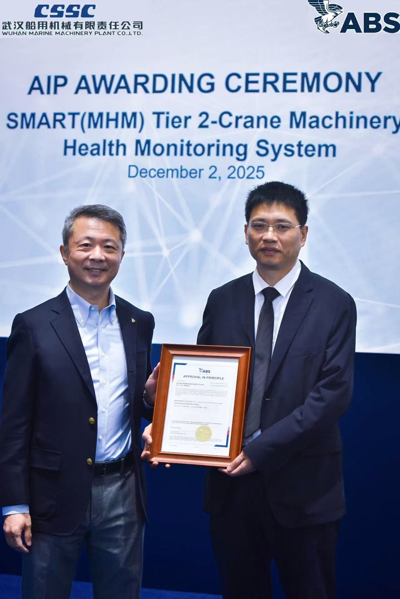 12月2日,2025年中國國際海事技術學術會議和展覽會開幕首日,中船武漢船機開發(fā)的海工吊機智能化健康監(jiān)測系統(tǒng)(SMART系統(tǒng))獲得ABS船級社SMART(MHM TIER 2)原則性批準(AIP),這是國內(nèi)海工吊機首個成功取得該AIP認證的系統(tǒng)。ABS船級社技術副總裁谷海、中船武漢船機副總經(jīng)理胡發(fā)國出席發(fā)證儀式。